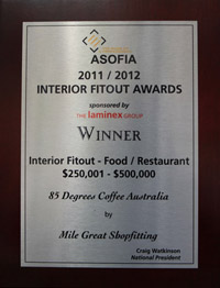 Mile Great Shopfitting, won the 2011/2012 Interior Fitout Awards - Best Food & Restaurant Fitout in $250,000 - $ 500,000 category for our project on 85 Degrees Cafe at Hurstville.